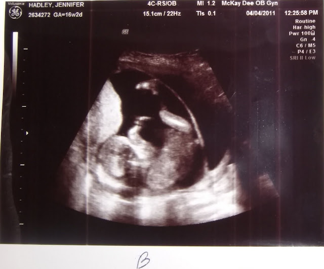 Baby "B" was cooperating and Dr. Wood said not to hold her to it, but she thinks this one is a girl. :) My next ultrasound on May 4th is my major one that I will find out both sexes for sure. We're hoping for a boy and a girl, but whatever will be great. They both have perfectly healthy heartbeats and she had no concerns at this appointment.