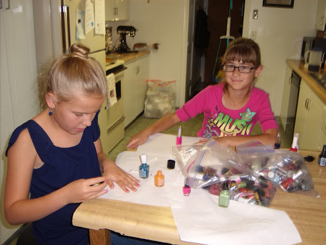 Baylee helps Molly paint her nails. When Abbee was done, I helped the rest of the girls finish up.