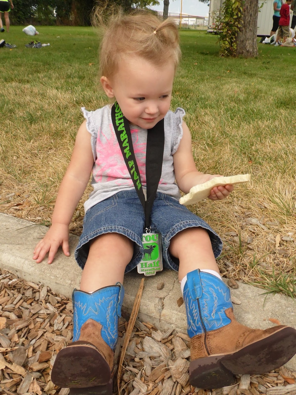 As I sprinted passed Brandon and the kids, Willie was so cute! Once he saw me he started jumping up and down yelling, "Mama! Mama! Mama!" Then the twins joined in with him. I was waving and all smiles as I passed them. I did it! They put a metal around your neck as everyone finishes.